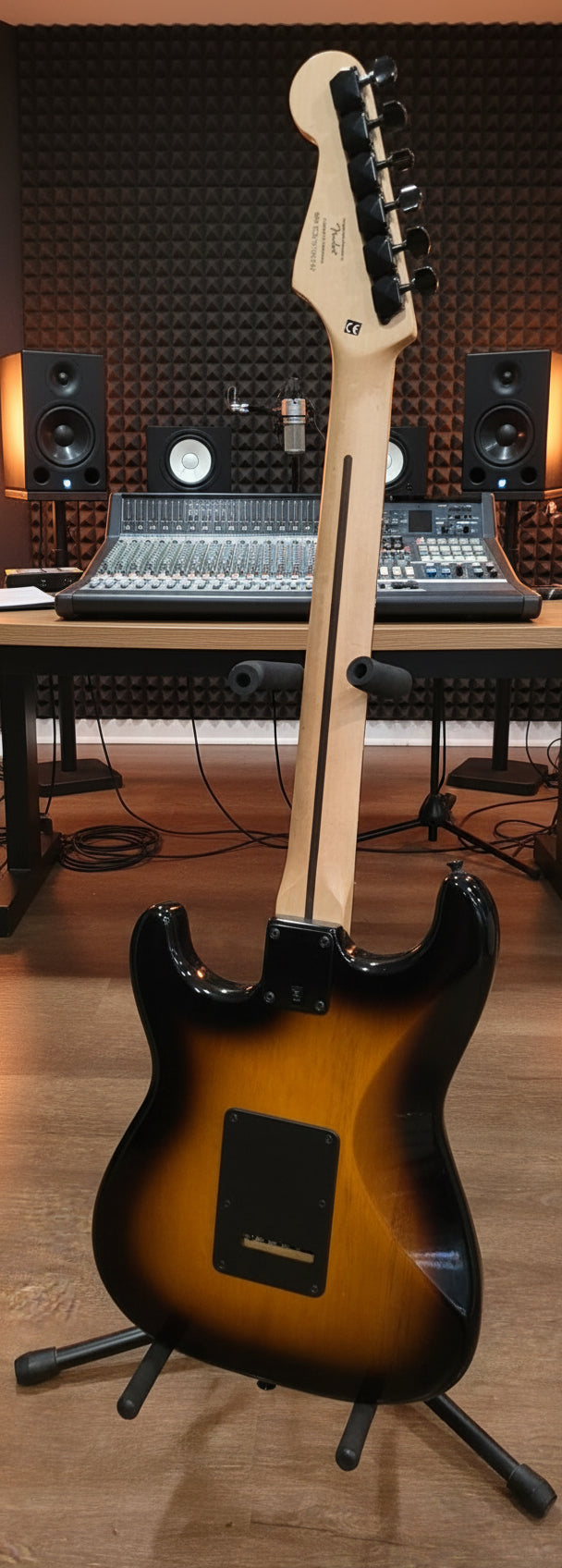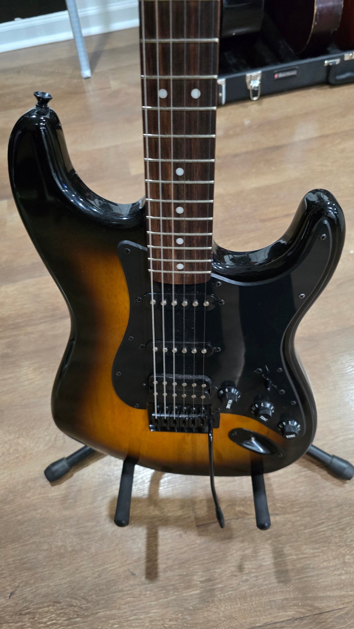 Pre-Owned Squier (by Fender) Stratocaster HSS in 2 Tone Sunburst offers classic style and versatile tone in great condition. Featuring a solid body, maple neck with a rosewood fingerboard, and HSS pickup configuration—humbucker at the bridge and single coils in the middle and neck—for a powerful range of tones. 21 frets and a 5-way selector switch provide excellent playability for any genre. This guitar delivers reliability and performance with iconic Stratocaster looks.
